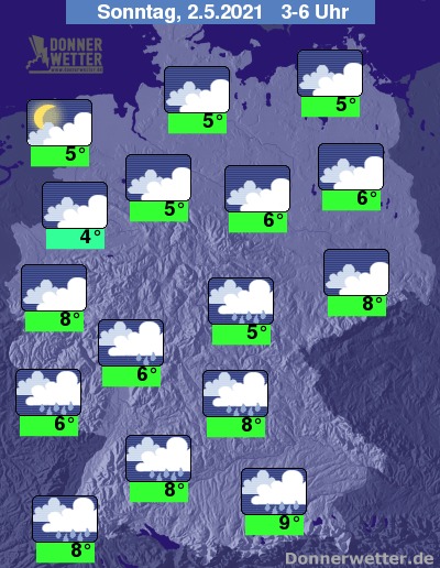 In der folgenden Nacht ist der Himmel über dem Nordseeumfeld oft aufgelockert bewölkt. Im übrigen Land halten sich weitgehend dichte Wolken und von Süden breitet sich Regen langsam nordwärts auf und umfasst zum Morgen hin in etwa die gesamte Südhälfte des Landes. Die Temperatur sinkt auf 9 Grad in München und bis 4 Grad in Münster.