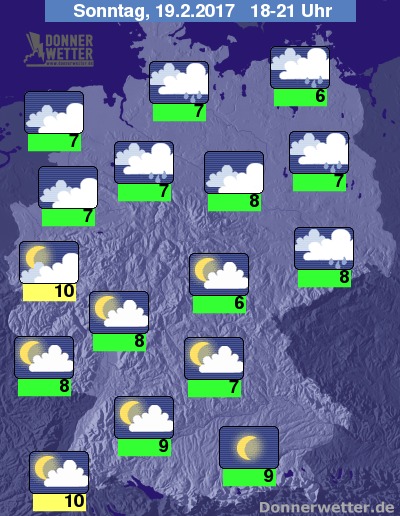 Heute Abend ist der Himmel über dem Süden locker bewölkt oder sternenklar. Über der Nordhälfte ist es bedeckt und es fällt zeitweise Regen. Dazwischen ist es noch teils aufgelockert, teils auch schon stark bewölkt, aber noch meist trocken. Die Abendtemperaturen liegen bei 10 Grad im Oberrheingraben und etwa 6 Grad in Neubrandenburg.
