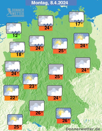 Am Montag ist es vor allem im Süden, teilweise auch noch im Osten heiter, hier bleibt es weitgehend trocken. Im übrigen Land ist es wechselnd oder stark bewölkt und bevorzugt im Nordwesten, aber auch im Norden und Westen bilden sich Schauer, örtlich entwickeln sich auch Gewitter. Die Temperatur steigt auf frische 12 Grad an der Nordsee und bis 26 Grad in Schwaben.