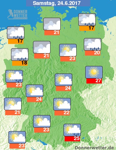 Der heutige Samstag zeigt sich besonders über der Südhälfte Deutschlands verbreitet heiter und teils sonnig, am Alpenrand sind dennoch einzelne Schauer möglich. Weiter im Norden halten sich dagegen überwiegend dichte Wolken, die hier für zeitweilige Niederschläge sorgen. Die Temperaturspanne liegt zwischen 17 Gard an der See und bis 27 Grad in Dresden.