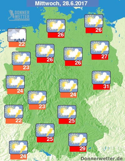 Am Mittwoch zeigt sich vor allem in den östlichen Landesteilen zunächst noch oft die Sonne, sonst ziehen jedoch bereits oft dichte Wolken durch, die zeitweise Schauer und lokal auch Gewitter bringen, dazwischen kann es aber auch immer wieder auflockern. Die Temperatur steigt auf 22 Grad in Emden und bis 31 Grad in Dresden.