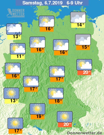 Der Samstag startet meist heiter bis wolkig oder aufgelockert bewölkt, zwischen Ostseeküste und der Märkischen Schweiz sowie an der Nordseeküste ist es teils auch bedeckt. Südlich der Donau gibt es bereits in den frühen Morgenstunden strahlenden Sonnenschein. Bis auf einzelne Schauer im äußersten Nordwesten bleibt es trocken.