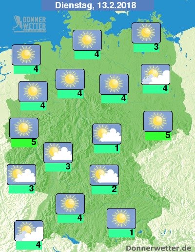 Am Dienstag scheint praktisch im gesamten Bundesgebiet die Sonne von einem oft auch wolkenlosen Himmel. Erst im Verlauf des Nachmittags und des Abends ziehen im Südwesten und Westen dichte Wolken auf, die jedoch zunächst keinen Schneefall bringen. Die Temperatur erreicht 1 bis 5 Grad.