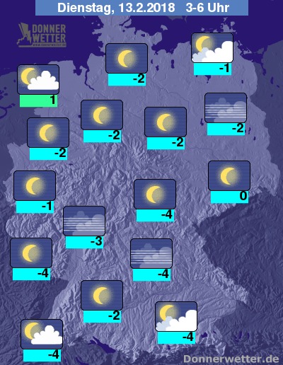 In der kommenden Nacht ziehen im Umfeld der See noch oft dichtere Wolken durch, die hier vereinzelt noch Schneeschauer bringen können. Auch am Alpenrand sorgen dichte Wolken für gebietsweise Schneefälle. Im großen Rest der Republik klart der Himmel hingegen auf und es bleibt trocken. Die Temperatur sinkt auf 1 Grad im nördlichen Emsland und bis -4 Grad in Mittelfranken.