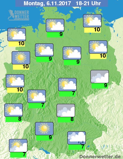 Heute Abend ist es im Südosten dicht bewölkt bei zeitweiligem Regen. Über Sachsen und dem Südwesten ist es noch teils stark, teils auch schon aufgelockert bewölkt und dabei weitgehend trocken. Im übrigen Bundesgebiet ist es verbreitet heiter bis sonnig und trocken. Die Temperatur liegt bei 7 bis 10 Grad.
