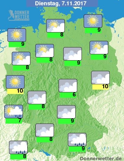 Am Dienstag strahlt über dem Norden und Westen häufig die Sonne und es ziehen sonst meist nur lockere Wolken durch, dabei ist es trocken. Weiter nach Süden und Osten hin werden die Wolken dicht und besonders im Alpenvorland fällt auch gebietsweise Regen, sonst ist es mehrheitlich trocken. Die Temperatur erreicht 6 bis 10 Grad.