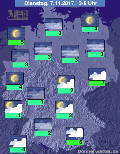 In der Nacht zum Dienstag halten sich über dem Süden, Südosten und über Sachsen meist dichte Wolken und vor allem am Alpenrand fällt auch gebietsweise Regen. Über Nordwesthälfte Deutschlands zeigt sich der Himmel dagegen verbreitet sternenklar, hier und da kann sich jedoch Nebel bilden, es bleibt trocken. Die Temperatur sinkt auf 6 Grad in München und bis auf etwa 1 Grad am Taunus.