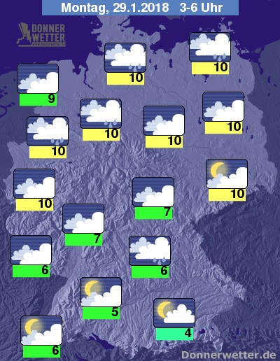 In der bevorstehenden Nacht ist es über dem Süden häufig leicht bis aufgelockert bewölkt und dazu trocken. Weiter nördlich ziehen hingegen meist dichte Wolken durch und Auflockerungen bleiben eher selten. Vor allem im Norden fällt gebietsweise Regen oder Sprühregen. Die Temperatur sinkt auf 10 Grad in der Norddeutschen Tiefebene und bis 4 Grad im Alpenvorland. An den Küsten weht ein teils starker bis stürmischer Wind.