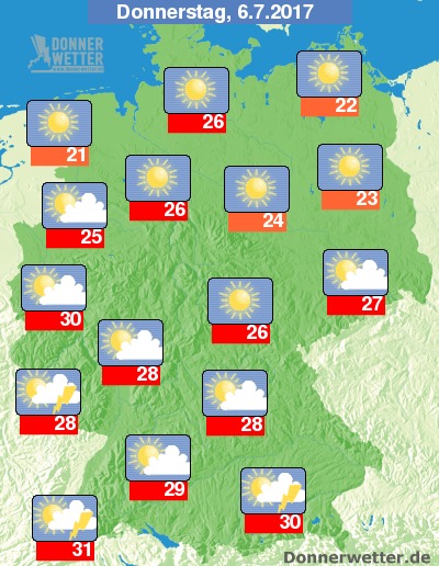 Am Donnerstag herrscht verbreitet heiteres bis sonniges Sommerwetter, im Südwesten sowie im Alpenvorland besteht nur ein leichtes Schauer- und Gewitterrisiko, im übrigen Bundesgebiet bleibt es aber trocken. Die Temperatur liegen bei 21 Grad im nördlichen Emsland und bis 31 Grad im Oberrheingraben.