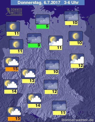 In der folgenden Nacht zeigt sich der Himmel über der Bundesrepublik verbreitet nur locker bewölkt und oft auch sternenklar, dazu bleibt es trocken. Die Temperatur sinkt auf 15 Grad in Düsseldorf und bis auf 9 Grad in der Norddeutschen Tiefebene.