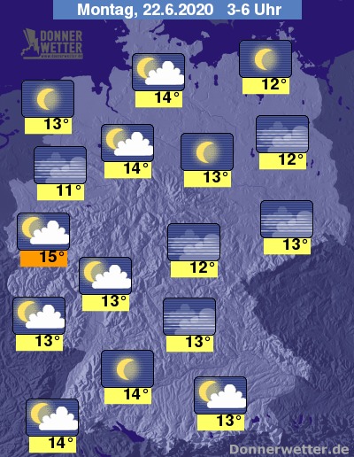 In der Nacht zum Montag klingen letzte Schauer im Alpenvorland und an Rhein und Ems ab und der Himmel lockert mehr und mehr auf. In den übrigen Landesteilen ist es schon verbreitet sternenklar oder nur gering bewölkt und dazu trocken. Die Temperatur sinkt auf 15 Grad in der Kölner Bucht und bis 12 Grad an der Müritz.
