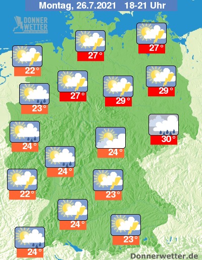 Heute Nachmittag ist es über dem Norden und Osten überwiegend aufgelockert, teils aber auch stark bewölkt, dazu bilden sich nur vereinzelt Schauer oder Gewitter. Im übrigen Bundesgebiet ist es teils heiter, oft aber auch stark bewölkt, dabei bilden sich gebietsweise Schauer und örtliche Gewitter. Die Temperatur liegt bei 20 Grad am Pfälzer Wald und bis 29 Grad in der Lausitz.