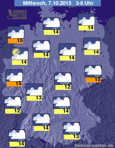 In der bevorstehenden Nacht bleibt es über Deutschland bei einer überwiegend starken oder dichten Bewölkung, Auflockerungen sind am ehesten im Nordwesten und Westen möglich. Vor allem über Süddeutschland fällt verbreitet starker und langanhaltender Regen, sonst fällt in einem breiten Streifen zwischen Schleswig-Holstein bis nach Thüringen hinein zeitweise Regen. In den übrigen Landesteilen bleibt es hingegen zumeist trocken. Die Temperatur sinkt auf 15 Grad an der Nordsee und bis 12 Grad am Bodensee.