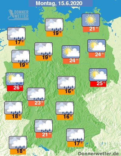 Am Montag bleibt es nach Nordosten hin heiter bis sonnig und trocken. Im übrigen Bundesgebiet ist es oft stark, teils aufgelockert bewölkt und es bilden sich gebietsweise Schauer, entlang des Rheins auch örtliche Gewitter. Die Temperatur erreicht 17 Grad in Cuxhaven und bis 26 Grad in Köln.