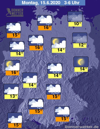 In der Nacht zum Montag fällt in einem breiten Streifen von Nordwesten bis zum Südosten Deutschlands sowie im gesamten Süden unter dichten Wolken zeitweise Regen. Dagegen ist es vom Osten bis zum Nordosten Deutschlands meist sternenklar und dazu trocken. Im Westen ist es meist stark, teils aufgelockert bewölkt und dazu meist trocken. Die Temperatur sinkt auf 16 Grad in Hannover und bis 10 Grad in Stralsund.