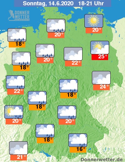 Heute Abend zeigt sich das Wetter im Nordosten weiterhin heiter bis sonnig und trocken. Im übrigen Land ist es mehrheitlich stark oder dicht bewölkt und es bilden sich wiederholt Schauer sowie örtliche Gewitter. Im Norden und Osten bleibt es dazu jedoch größtenteils trocken, einzelne Schauer sind dennoch möglich. Die Temperatur liegt bei teils 16 Grad in Augsburg und bis zu 25 Grad in Berlin.