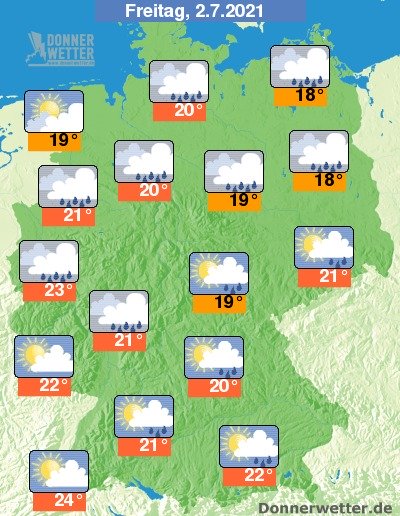 Am Freitag ist es im Südwesten des Landes häufig heiter bis sonnig und weitgehend trocken. Im übrigen Land ist es teils heiter, teils ziehen dichte Wolken durch, dabei bilden sich einzelne Schauer, örtlich entwickeln sich auch Gewitter. Die Temperatur steigt auf 18 Grad in Schwerin und bis 24 Grad in Freiburg.