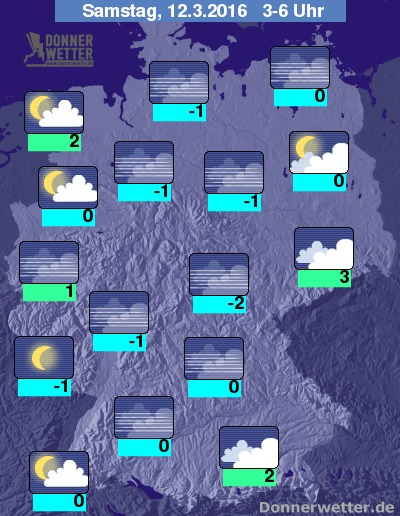 In der Nacht zum Samstag ziehen über den Osten und am Alpenrand dichte Wolken durch, die hier und da auch etwas Regen, Schneeregen oder Schnee bringen können, dabei besteht stellenweise Glättegefahr! Im übrigen Bundesgebiet ist es hingegen meist sternenklar oder nur locker bewölkt, dabei bleibt es trocken. Stellenweise bildet sich Nebel und Rauhreif! Die Temperatur sinkt auf 3 Grad in Dresden und -2 Grad im Eichsfeld.