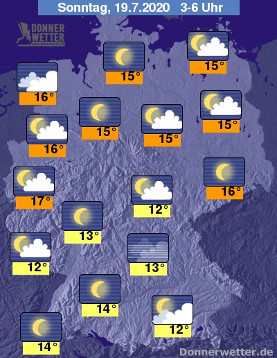In der kommenden Nacht ist es verbreitet locker bewölkt oder der Himmel zeigt sich sternenklar. Dichte Wolken halten sich zeitweise in Nordseenähe, hier sind vereinzelt Schauer möglich, sonst bleibt es jedoch trocken. Die Temperatur sinkt auf 17 Grad in Bonn und bis etwa 12 Grad in München.