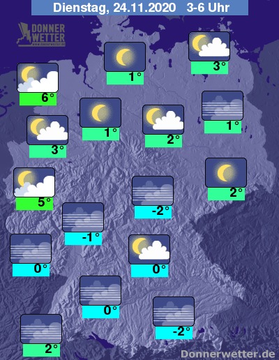 Die Temperaturen erreichen um -3 Grad in Nordbayern und um 6 Grad in Ostfriesland.