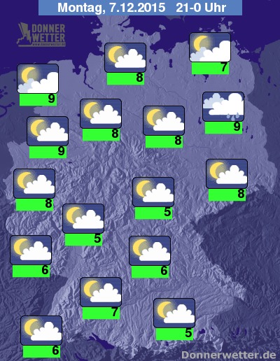 In der Nacht zum Dienstag ist es zunächst vor allem über der Nordhälfte noch oft aufgelockert und teils stark bewölkt, jedoch trocken, im übrigen Land ist es bereits meist sternenklar und im weiteren Verlauf klart der Himmel auch über der breiten Landesmitte meist auf. Im Norden bleibt es bis zum Morgen hin bei einigen Wolken, dazu bleibt es weiterhin trocken. Die Tiefstwerte liegen bei 8 Grad in Papenburg und etwa 2 Grad in Nürnberg. Stellenweise bildet sich Nebel oder Hochnebel.