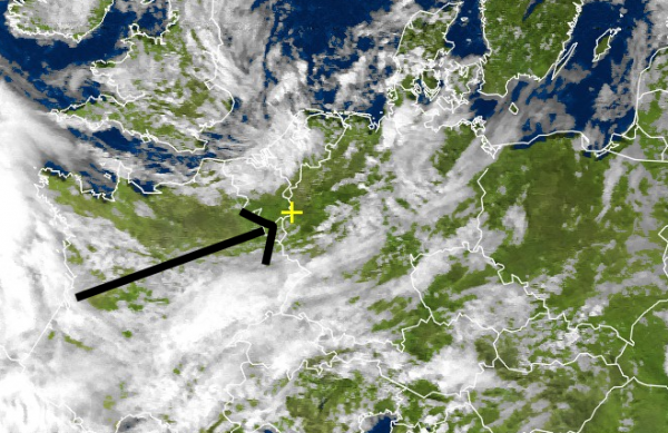 Auf dem Satellitenbild ist der neue Regen für Mittwoch schon zu sehen: Der Pfeil zeigt den Weg der Regenwolken vom Atlantik an.