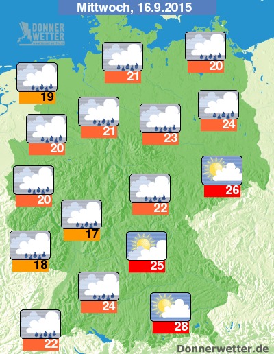 Am Mittwoch bleibt es im Südosten und im äußeren Osten des Landes weitgehend locker oder aufgelockert bewölkt und trocken. Im großen Rest des Landes ziehen aber überwiegend dichte Wolken durch und es fällt zeitweise, zum Teil kräftiger, langanhaltender und auch ergiebiger Regen, dazu besteht für Autofahrer die Gefahr durch Aquaplaning bei zusätzlich teils schlechten Sichtverhältnissen. Besonders im äußeren Westen und Südwesten sind auch einzelne Gewitter möglich. Die Temperatur steigt auf 17 Grad am Taunus und bis auf sommerliche 28 Grad in München. Zusätzlich weht im Westen und Norden des Landes ein verbreitet frischer bis starker Wind, an der Nordsee und in den Mittelgebirgen sind Sturmböen möglich.