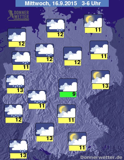 In der folgenden Nacht bleibt es über der Osthälfte der Republik aufgelockert bis stark bewölkt und dabei trocken. In den westlicheren Bundesländern ziehen aus Westen her jedoch verbreitet dichte Wolken auf und es fällt oft langanhaltender und auch ergiebiger Regen, dabei besteht für Autofahrer u.a. die Gefahr durch Aquaplaning und es herrschen teils sehr schlechte Sichtverhältnisse. Die Temperatur sinkt auf 13 Grad in der Kölner Bucht und bis 9 Grad im Grabfeld.