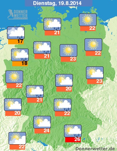 Der Dienstag wird schon häufig freundlich und es bleibt auch vielerorts trocken, mit Schauern und Gewittern ist vor allem im Süden, Südosten und im Nordwesten zu rechnen, sonst scheint die Sonne zum Teil längeranhaltend und es besteht nur ein kleines Schauerrisiko. Mit Werten zwischen 17 Grad in Ostfriesland und etwa 26 Grad in München wird es ähnlich warm wie am Vortag.