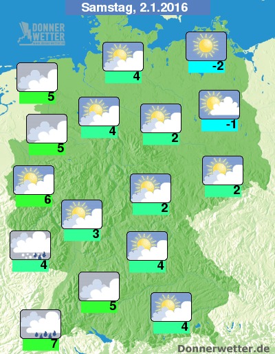 Das erste Wochenende im Jahr startet besonders im Norden und im Osten Deutschlands verbreitet winterlich mit Temperaturen um oder oft auch unter der 0-Grad-Marke! Hier kann sich sowohl am Samstag als auch am Sonntag auch immer wieder die Sonne zwischen eher lockeren Wolken zeigen. Im übrigen Land bleibt es hingegen oft stark bewölkt oder trüb, jedoch ebenfalls meist trocken, hier und da ist Sonnenschein möglich. Am Sonntag ziehen im Süden dichte Wolken mit Regen, Schneeregen oder Schnee auf, dabei ist auch mit Straßenglätte zu rechnen! Im übrigen Land bleibt es weiterhin weitgehend trocken. Die Temperturen erreichen am Samstag -2 bis +7 Grad, am Sonntag werden -5 Grad im Nordosten und um +6 Grad im Breisgau erreicht. Im Folgenden noch die Wetterkarte für den Samstag: