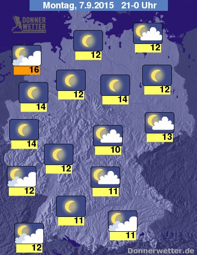 In der Nacht zum Dienstag zeigt sich der Himmel überwiegend sternenklar, besonders im Nordwesten ziehen jedoch teils dichte Wolken auf, dabei bleibt es trocken. Stellenweise bildet sich bis zum Morgen jedoch Nebel oder Dunst. Die Temperatur sinkt auf 15 Grad in Ostfriesland und bis 5 Grad in Mittelfranken.