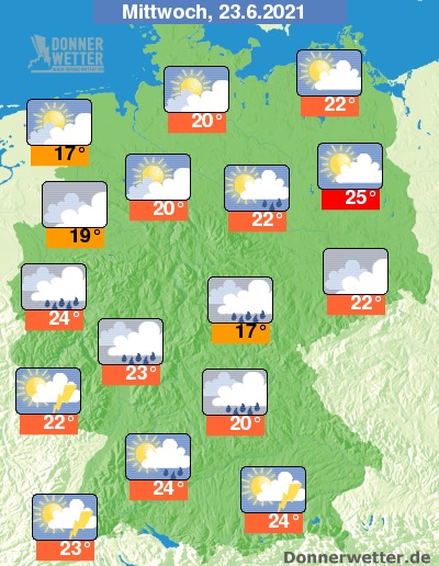 Am Mittwoch ist es im Süden stark bewölkt und es bilden sich hier vielerorts Schauer, zudem entwickeln sich einzelne Gewitter. Über dem Norden ist es dagegen meist heiter und trocken. Im übrigen Land ist es teils heiter, teils stark bewölkt, dabei bleibt es zumeist trocken. Die Temperatur steigt auf 17 Grad in Jena und bis 25 Grad in Berlin.