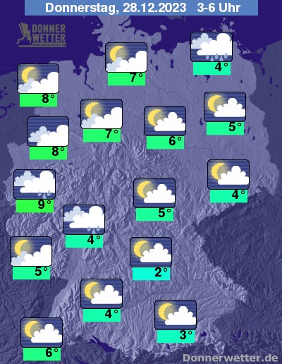 In der Nacht zum Donnerstag ist es im Süden und Osten teils nur locker bewölkt, hier bleibt es trocken. Im übrigen Land ziehen größtenteils viele und zumeist auch dichte Wolken durch, dazu ist auch vereinzelt Regen möglich. Die Temperatur sinkt auf 9 Grad im Rheinland und bis 4 Grad an der Müritz. Im Norden und Westen weht ein oft starker Wind mit möglichen stürmischen Böen. An der Ostsee ist es oft stürmisch, an der Nordsee herrscht Sturm, hier sind vereinzelt auch orkanartige Böen möglich.