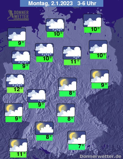 In der Nacht zum Montag zieht über die Nordwesthälfte von Deutschland kompakte Bewölkung mit Regen hinweg. Im Süden und Osten ist es oft stark, vor allem im Südosten auch oft nur locker bewölkt, dazu bleibt es trocken. Die Temperatur sinkt auf 12 Grad in der Kölner Bucht und etwa 7 Grad in München.