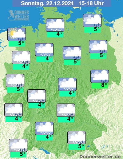 Am Sonntagnachmittag zeigt sich der Himmel stark bewölkt oder es ist bedeckt, dabei muss verbreitet mit Regen- oder Schneeregenschauern gerechnet werden. Von Nordwesten sinkt die Schneefallgrenze auf 400 bis 600 m, im Westen fällt teils auch oberhalb von 200 m Schnee.