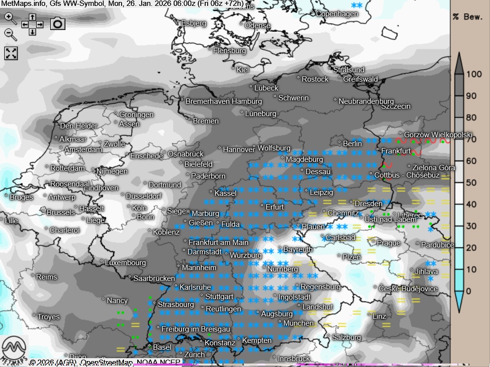 Am Montag zeigt sich der Himmel über weiten Landesteilen bedeckt. Vom Osten und Südosten bis in die Mitte fällt dabei zeitweise Schnee, in der Landesmitte örtlich auch Regen. Im Nordwesten und ganz im Südwesten bleibt es zu Wochenbeginn meist niederschlagsfrei.
