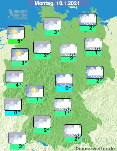 Am Montag halten sich von Bayern bis nach Brandenburg dichte Wolken und es fällt zeitweise Schnee, teils auch Schneeregen. Weiter nach Westen hin ist es oft trüb oder stark bewölkt, vor allem im Südwesten und Nordwesten zeigen sich aber auch oft heitere Abschnitte, dabein bleibt es trocken. Die Temperatur steigt auf 0 Grad im Saargau und bis 5 Grad im nördlichen Emsland.