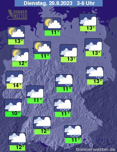 In der kommenden Nacht bleibt es vom Süden bis nach Sachsen und Thüringen bedeckt und es fällt zeitweise Regen, wobei sich die Niederschläge bis zum Morgen auch bis nach Sachsen-Anhalt ausbreiten. In den übrigen Landesteilen ist es oft stark, teils locker bis aufgelockert bewölkt und dazu weitgehend trocken. Die Temperatur sinkt auf 14 Grad im Rheinland und bis 10 Grad im Saargau.