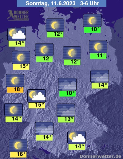 In der folgenden Nacht klingen letzte Niederschläge im Süden rasch ab und der Himmel klart auch hier, wie sonst schon zuvor verbreitet im übrigen Bundesgebiet, auf.. Die Temperatur sinkt auf 18 Grad in Köln und bis 10 Grad in Erfurt.