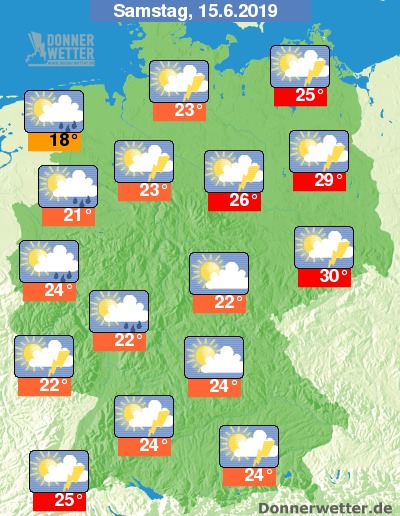 Heute ist es über dem Land oft heiter bis sonnig, gebietsweise ziehen aber auch einige Wolken durch, dabei bilden sich im Nordosten und im Süden vielerorts Schauer und Gewitter, sonst sind hingegen nur vereinzelt Schauer und Gewitter möglich. Die Temperatur steigt auf teils nur 18 Grad an der Nordseeküste und bis etwa 30 Grad in der Lausitz.