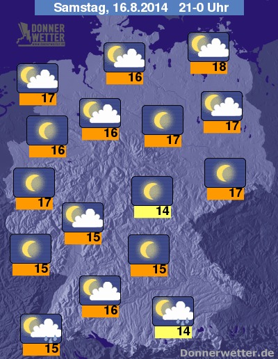 In der Nacht ist es vor allem in der Südhälfte verbreitet klar, stellenweise bildet sich Nebel. Im Seeumfeld können dichte Wolken zeitweise Regen bringen, sonst bleibt es bei aufgelockerter Bewölkung weitgehend trocken. Die Temperatur sinkt auf 14 Grad am Dollart und etwa 9 Grad am Saar-Nahe-Bergland.