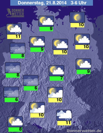 Heute Nacht hält sich am Alpenrand und zum Teil auch in einem Streifen von der Nordsee bis zum Niederrhein dichte Bewölkung und es fällt zeitweise Regen, sonst ist es bei meist lockerer bis aufgelockerter Bewölkung weitgehend trocken. Besonders im Ostseeumfeld ist es auch häufig sternenklar. Die Temperatur sinkt auf 11 Grad in München und 6 Grad im Westerwald.