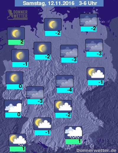 In der Nacht zum Samstag fällt am Alpenrand bei kompakten Wolken weiterhin Schnee, dazu besteht hier verbreitet Glättegefahr! Sonst lockert die Bewölkung im Süden meist auf und es fällt nur noch selten etwas Schnee. Im übrigen Bundesgebiet ist es meist sternenklar oder locker bewölkt, dazu bleibt es trocken. Stellenweise bildet sich jedoch Nebel oder Hochnebel, dabei kann es durch Rauhreifbildung glatt auf den Straßen werden! Die Temperatur sinkt auf 2 bis -4 Grad.