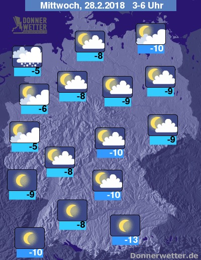 In der Nacht zum Mittwoch klart der Himmel vor allem im Süden weitgehend auf, sonst wird es oft gering bis wechselnd wolkig und dazu trocken. Dichtere Wolken halten sich im Umfeld von Nord- und Ostsee, hier sind auch weitere Schneefälle möglich. Die Temperatur sinkt auf -5 Grad in Düsseldorf und bis auf eisige -13 Grad in Rosenheim.