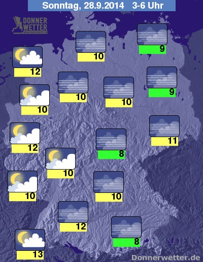 In der Nacht ist es häufig noch klar oder gering bewölkt, von Westen her können einige, weitgehend lockere Wolken hereinziehen, sonst kann sich gebietsweise Nebel oder Dunst bilden. Es bleibt aber überall trocken. Die Temperatur sinkt auf 13 Grad am Oberrhein und 8 Grad am Alpenrand.