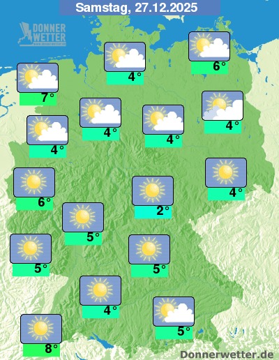 Heute ist es verbreitet heiter oder vor allem über der Südhälfte auch weitgehend nur sonnig. Vom Norden bis zur Landesmitte können im Tagesverlauf zum Teil dichte Wolken durchziehen, dabei bleibt es aber meist trocken. Die Temperatur erreicht 2 Grad in Erfurt und bis 8 Grad in Freiburg.