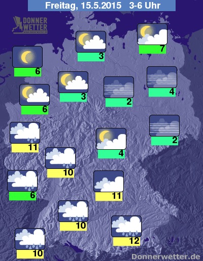 In der Nacht zum Freitag breitet sich das Regengebiet noch ein Stück weiter nach Nordosten hin aus, es umfasst etwa die Regionen ab und südwestlich eines breiten Streifens vom westlichen NRW bis in den Südosten Bayerns, dabei fällt zeitweise, im Südwesten auch teils langanhaltender und ergiebiger Regen. Im Norden und im Osten der Bundesrepublik bleibt es bei sternenklarem Himmel oder lockerer Bewölkung trocken. Die Temperatur sinkt auf 12 Grad in München und kühle 2 Grad in der Altmark.