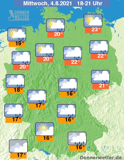 Heute Abend ist es im Norden gebietsweise locker bis aufgelockert, sonst jedoch verbreitet dicht bewölkt. Es bilden sich wiederholt Schauer und örtlich sind auch Gewitter möglich. Die Temperatur liegt bei 16 Grad in Mittelfranken und bis 23 Grad an der Müritz.