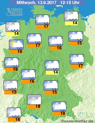 Am frühen Nachmittag nimmt die Niederschlagsintensität in den mittleren Landesteilen ab, teils kräftiger Regen fällt dann vor allem noch an den Küsten sowie im Südwesten. Die Sonne bleibt weiterhin auf Abstand, weiterhin muss vor allem im Norden mit Sturm- / Orkanböen gerechnet werden.