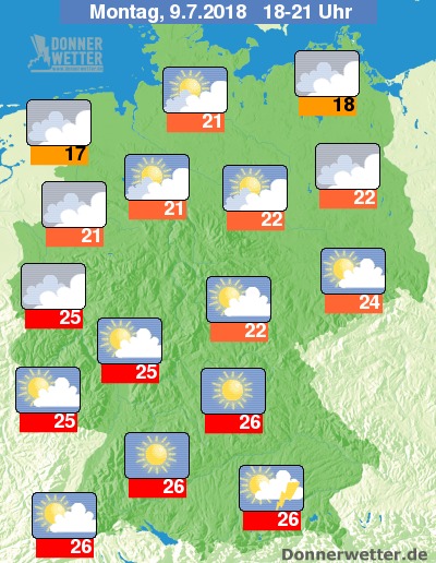 Heute Abend ist es über der Nordhälfte Deutschlands oft stark bewölkt, jedoch auch trocken. Im Alpenvorland bilden sich hier und da Schauer oder Gewitter, sonst ist es jedoch weiterhin verbreitet heiter bis sonnig und trocken. Die Temperatur liegt bei kühlen 17 Grad in Wilhelmshaven und bis 26 Grad in München.